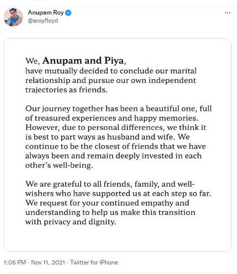 ঠিক কী লিখেছেন অনুপম রায়? অনুপম লেখেন, “আমরা দুজনে পারস্পরিক সম্মতিতে বিয়ের সম্পর্কটা ভেঙে বেরিয়ে আসবার সিদ্ধান্ত নিয়েছি, আমরা এবার নিজেদের পথে চলব বন্ধু হিসাবে”।